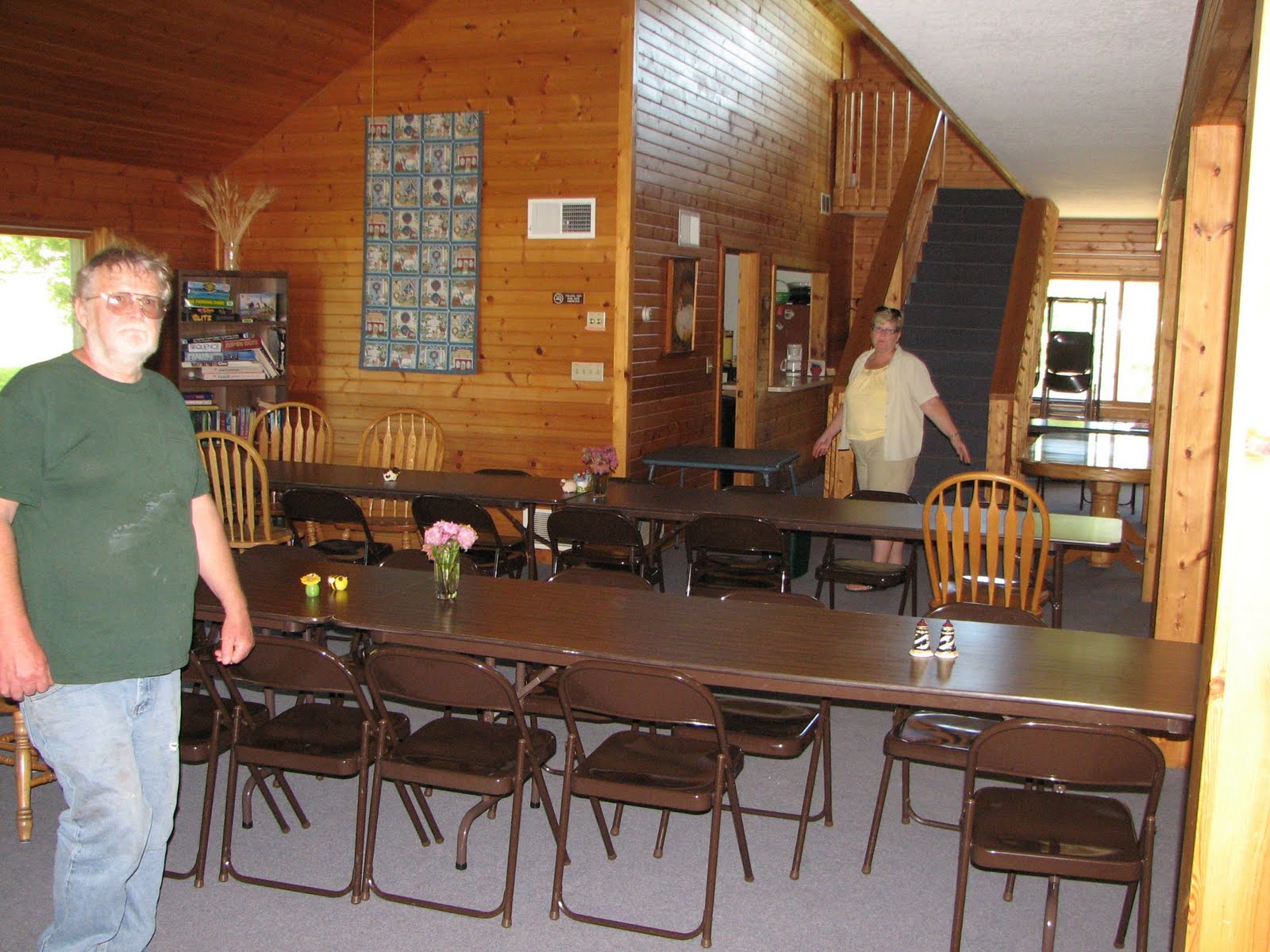 The Shed has a vaulted ceiling with pine sided walls and a corner stone fireplace in the large comfortable meeting space with couches, tables, and folding chairs. There is a full kitchen, a men’s and a women’s bathroom with showers and nine guest rooms, each with two twin beds. The three main floor bedrooms each have one additional futon for a total of 21 beds. This building has central air and heat with separate electric heat available in each bedroom.